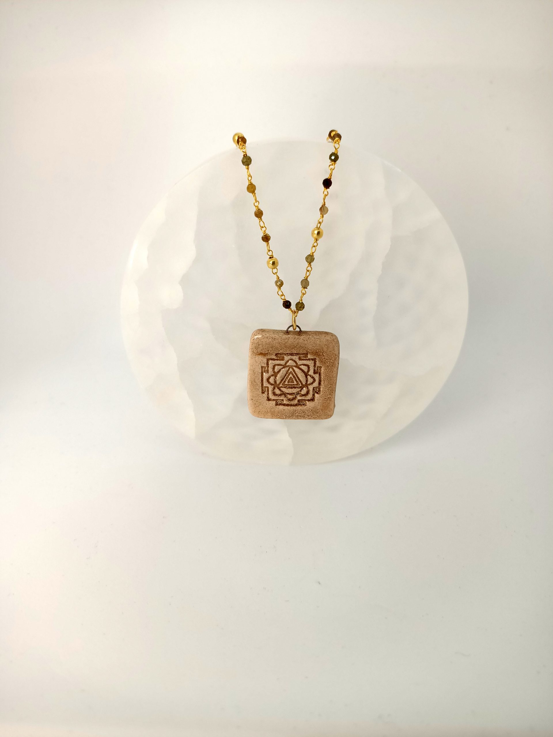 Be4 Rituals Kali Yantra Kolye, koruma, kişisel güç ve odaklanma için tasarlanmış güçlü bir semboldür. Elde özenle üretilmiş seramik kolye ucu, özel kesim turmalin doğal taş ve gümüş zincir ile sunulmaktadır.